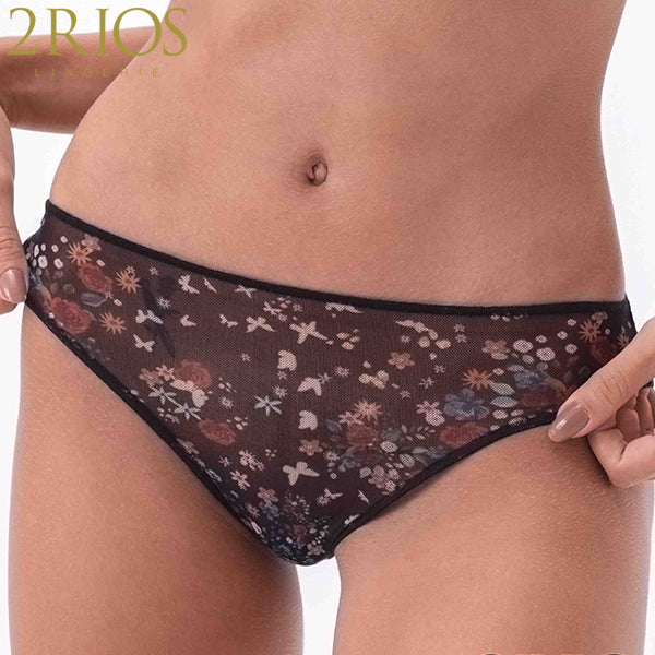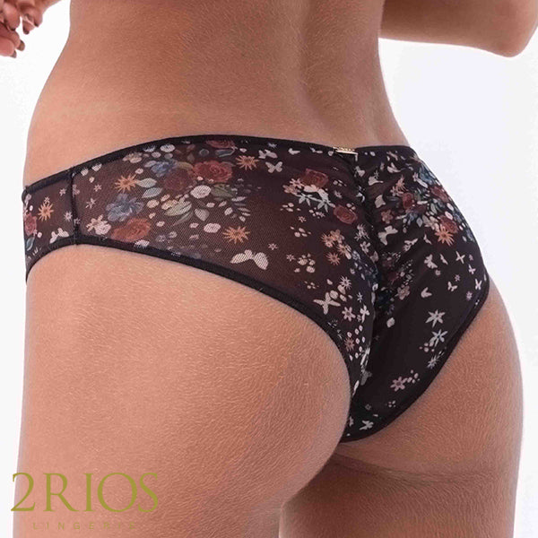 Calcinha em tule estampado com detalhe frufru no bumbum. Frente modelagem tanga. Laterais medianas. Franzido nas costas efeito empina bumbum. Tule estampado toque macio e elasticidade que veste no corpo perfeitamente. Estampado com fundo preto e transparência leve. Tendência de moda! Elásticos de microfibra em overlock! Ultrafino! +conforto +durabilidade e não marca na roupa!