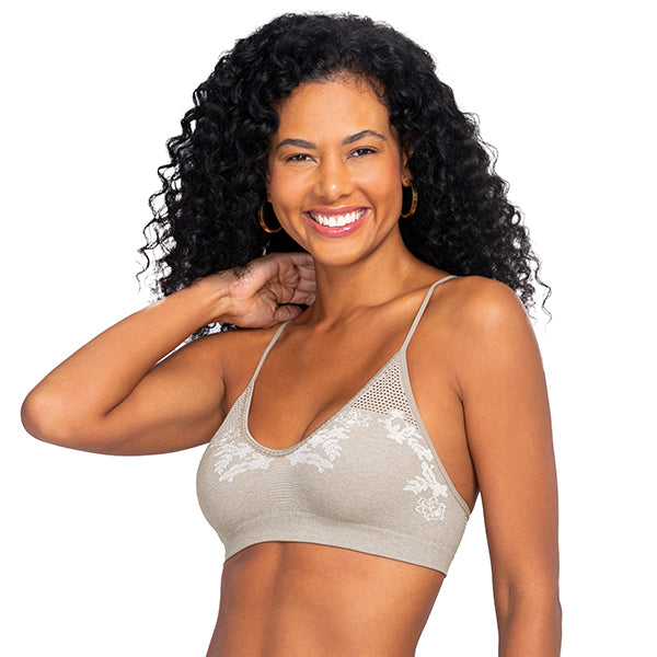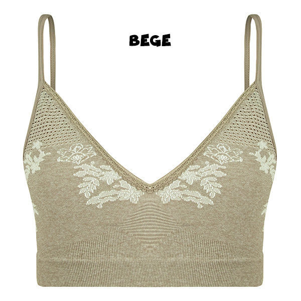 Confeccionado em microfibra elástica, leve e extremamente confortável. Top sem aro com busto anatômico, que acomoda os seios confortavelmente. Parte frontal com delicado bordado floral e detalhes vazados por toda a peça. Central do decote com leve drapeado e base em tecido duplo canelado. Com a tecnologia sem costura, que não marca sob a roupa. Alças finas sem regulagem. Costas sem fecho.