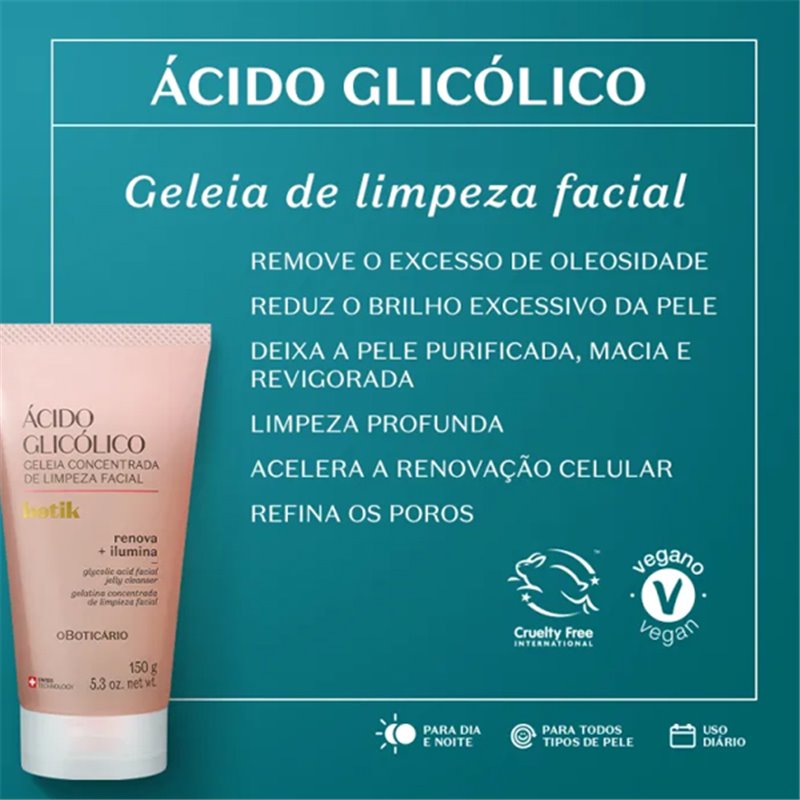 Além disso, a geleia facial vegana possui fórmula com 3% de Ácido Glicólico que: